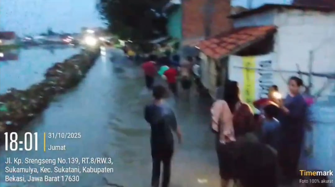 Diketahui banjir disejumlah titik mencapai kedalaman lutut orang dewasa hingga 1 meter, di kampung Srengseng RT 03/03 Desa Sukamulya, Kecamatan Sukatani, Kabupaten Bekasi, Jawa Barat, Sabtu (1/11/2025).
